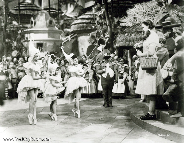 Colorized shot of Dorothy and the Munchkins