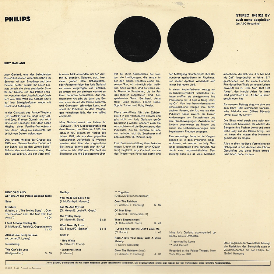 This is the rare German release, on the Phillips label, of the ABC Records release of the last legitimate original release of a Garland concert. Recorded during the first three nights of Judy's third and final Palace appearance from July 31, 1967 through August 26, 1967, the album was rushed out by ABC Records on August 15, 1967, while Judy was still appearing there.