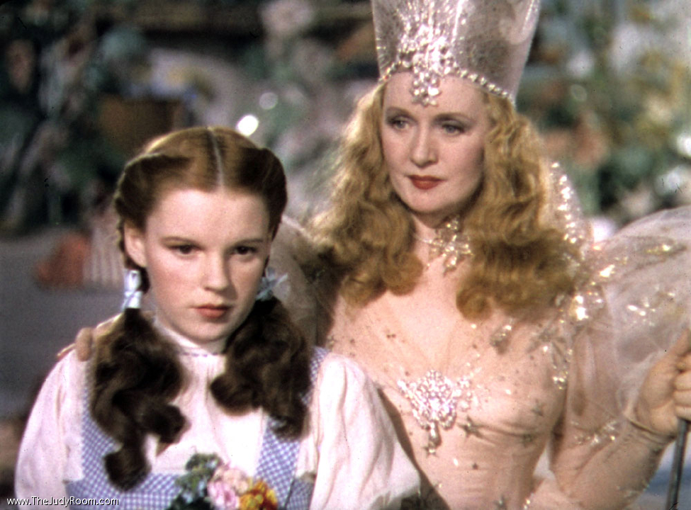Billie Burke and Judy Garland are caught in a candid moment on the Munchkinland set.